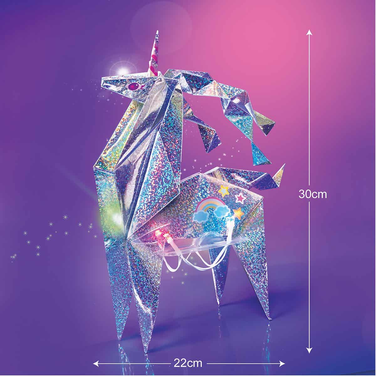 קיפול הנייר המצורף ליצירת חד קרן, קישוט באמצעות מדבקות וחיבור לסוללה כדי שיאיר וינצנץ לקישוט מרהיב.