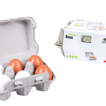 הביצים עשויות מעץ, סה"כ 6 ביצים בצבע לבן וחום. יושבות בתבנית ביצים קטנה מקרטון, בדיוק כמו הדבר האמיתי.