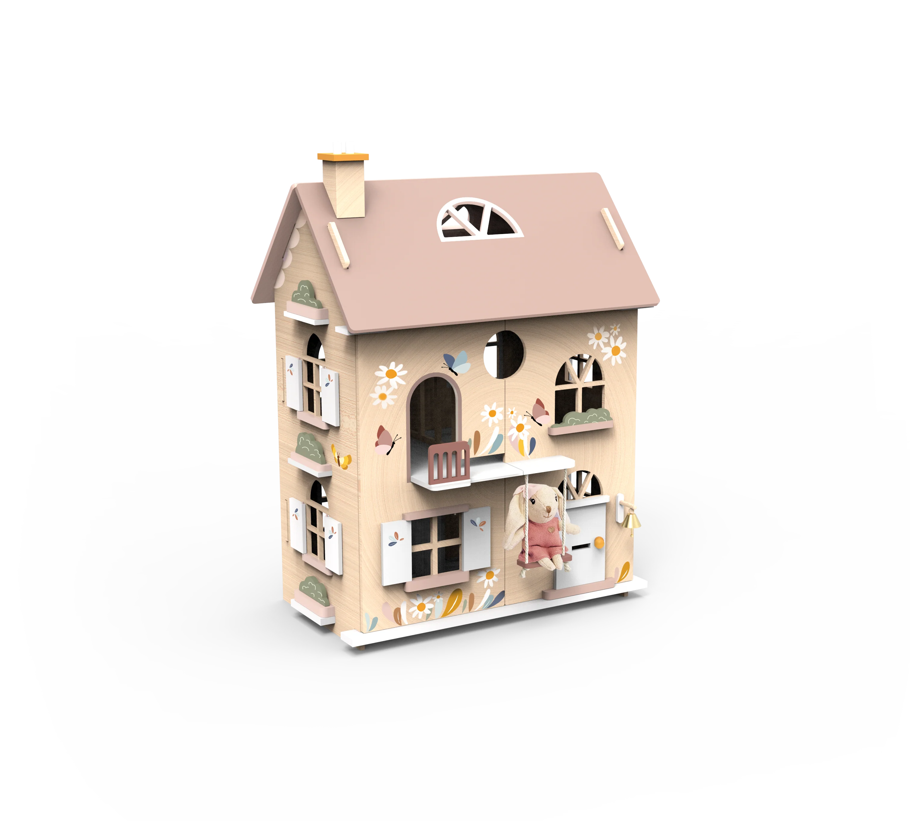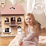 בית בובות מעץ הכולל אביזרים, מתוך קולקציה המציעה צעצועי פרימיום המשלבים עיצובי סגנון חיים עכשווי המותאמים לצעצועים מסורתיים.