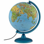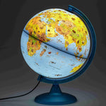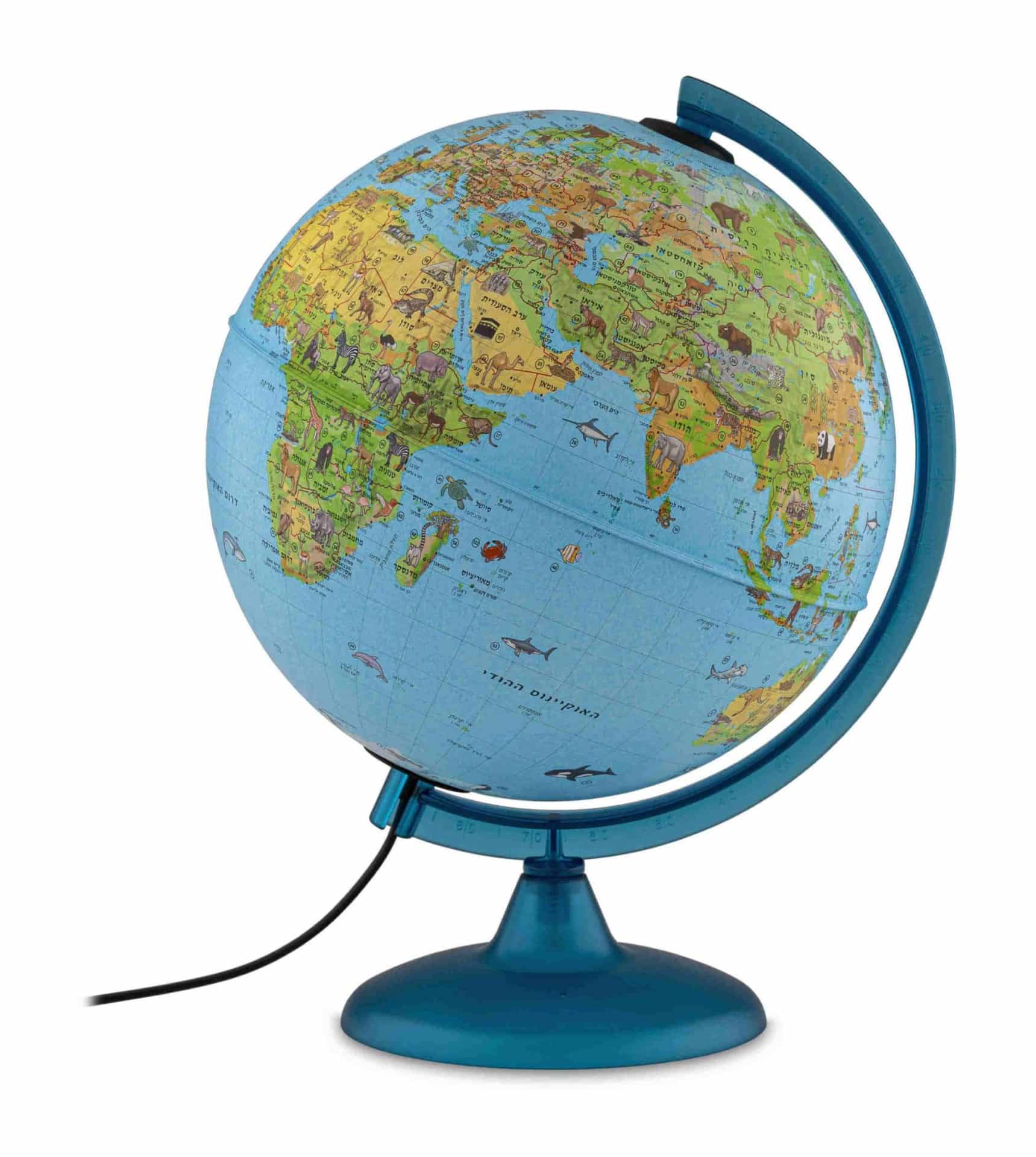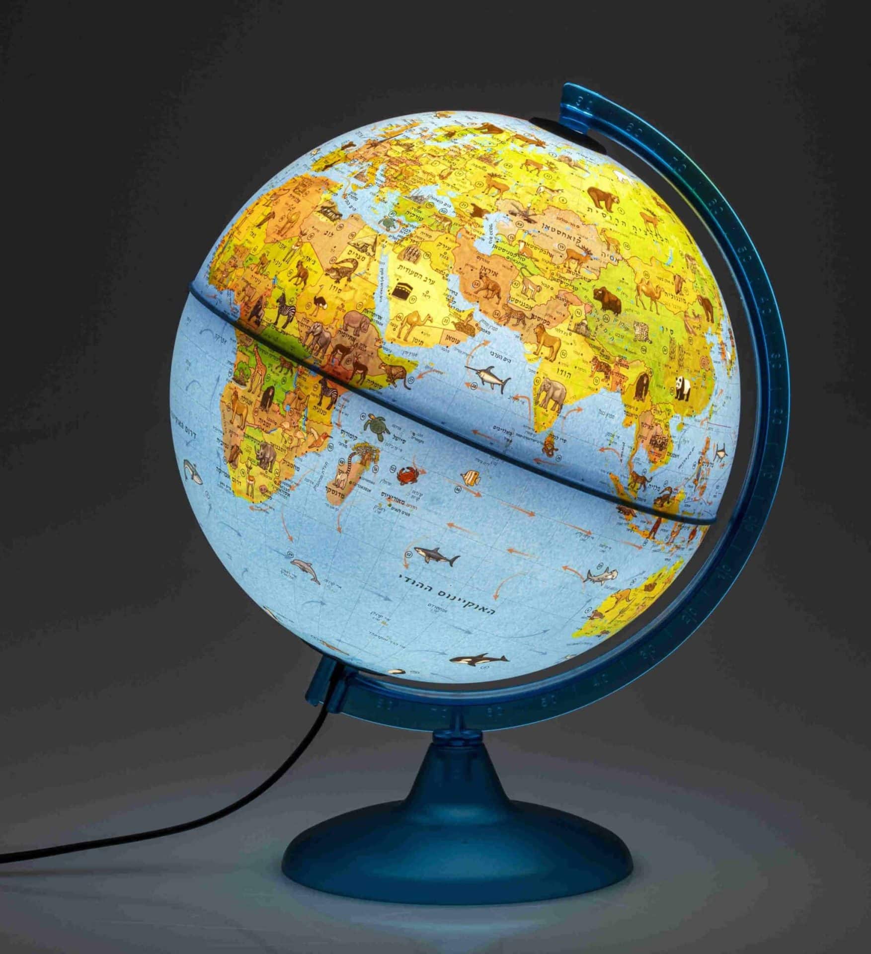 גלובוס בעברית מלאה עם תאורת לד. על הגלובוס תמונות של חיות טיפוסיות לכל איזור על פני כדור הארץ.