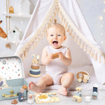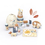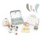 מה הוא כולל? מגדל השחלה בדמות ארנב, קוביות מעץ לבנייה, משחק משיכה קיפוד על גלגלים, פאזל מעץ.  הכל מגיע בתוך מזוודה מקסימה מקרטון קשיח. בצבעים,  עדינים וידית נשיאה מוזהבת שאפשר יהיה לקחת לכל מקום.