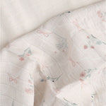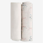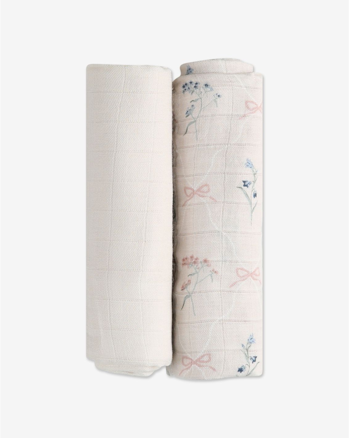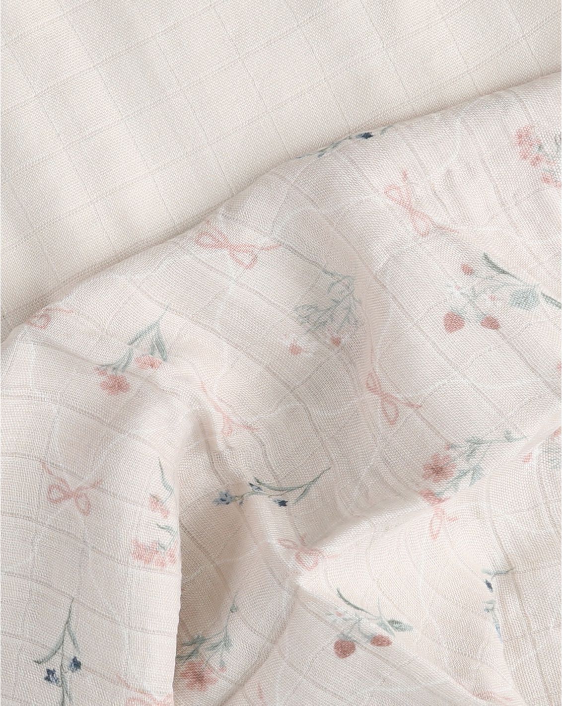 זוג חיתולים בגוונים נעימים בסגנון וינטאג', מידה של כל אחד מהם 70X70 ס"מ. חיתול אחד חלק בצבע ורוד עתיק בהיר בהיר, והשני על אותו רגע עם הדפסי פרחים וסרטים עדינים ויפים. מגיע באריזת קרטון
