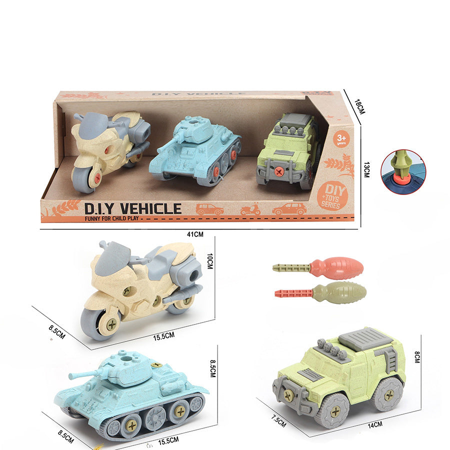 3 רכבים למשחק והרכבה. ג'יפ, טנק ואופנוע כל אחד מהרכבים כולל ברגים גדולים אותם ניתן באמצעות 2 המברגים המצורפים לפרק ולהרכיב.