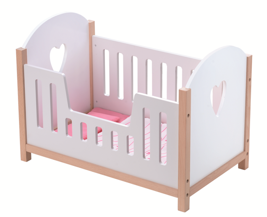 מיטה מעץ בצבע לבן ושילוב עץ טבעי, צד אחד נמוך יותר, שתי הדפנות עגולות עם פתח בצורת לב. למיטה מצורפים גם מצעים בצבעי ורוד ולבן.