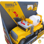 משאית בצבע צהוב, עם מערבל בטון שניתן לסובב ולשפוך את הבטון באתר הבנייה, מסידרת רכבי העבודה החדשים שלנו.
