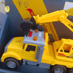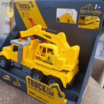 משאית בצבע צהוב, עם דחפור מתקפל שניתן להרים איתו חול ולסובב אותו באתר הבניה, מסידרת רכבי העבודה החדשים שלנו.