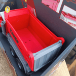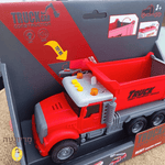 משאית בצבע אדום, עם ארגז גדול שניתן להרים אותו למעלה ולמטה כדי לשפוך את החול והעפר לשטח הבנייה, מסידרת רכבי העבודה החדשים שלנו..