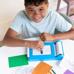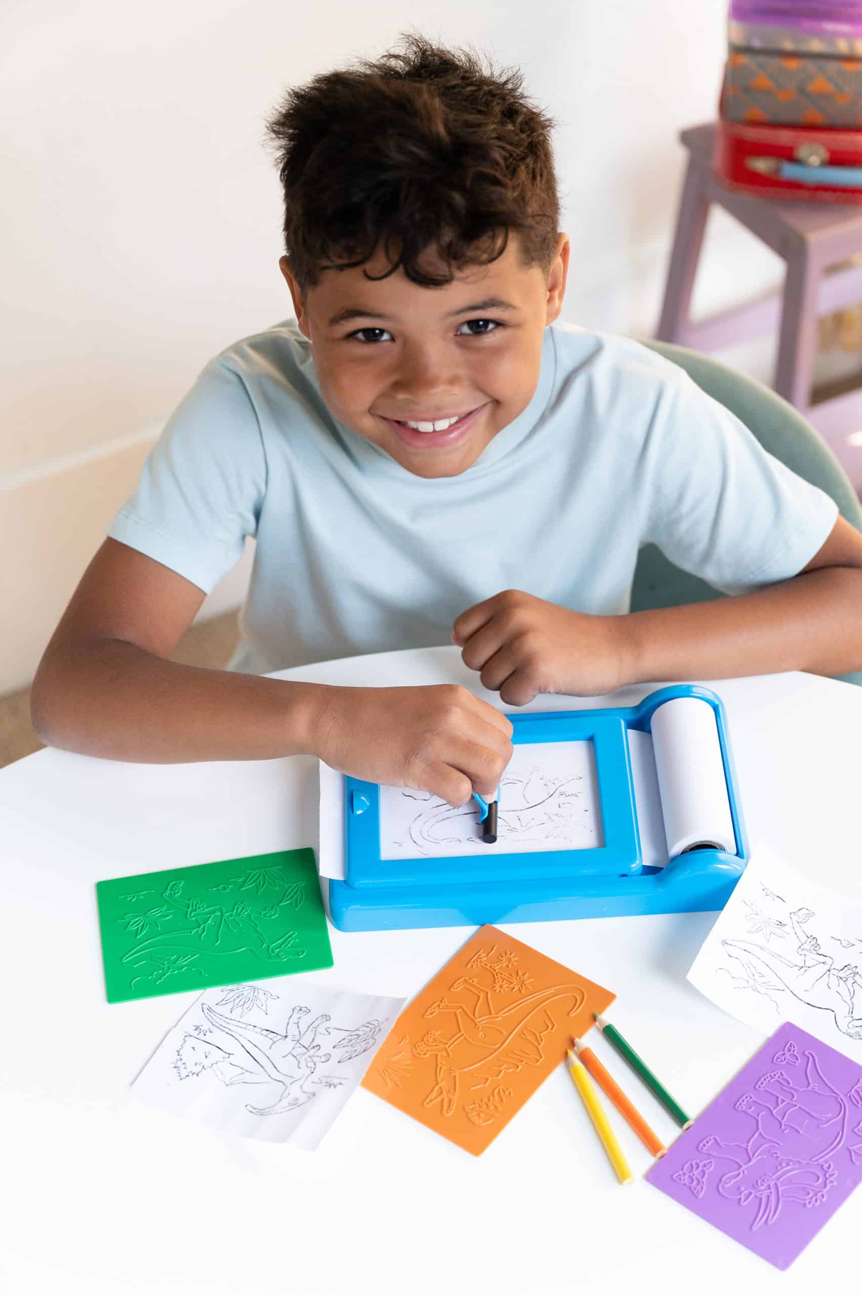מכניסים את הנייר למכשיר, ממקמים את אחד מהתבליטים, בוחרים צבע, ומשפשפים את הצבע בעזרת מחזיק העפרון המצורף על גבי הנייר. מה שקורה בעצם זה שכל מה שבולט בשבלונה, עובר לדף. נותר הדפס של דינוזאור.