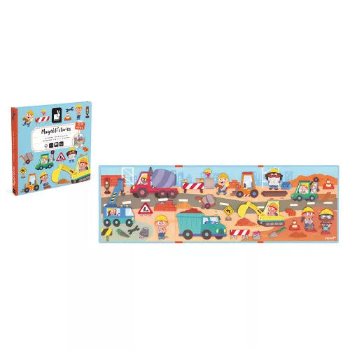 משחק מגנטי בנושא אתר בניה. המשחק כולל לוח רקע צבעוני עם איורים מעולם כלי עבודה, ו 30 מגנטים למשחק. הילדים יכולים למקם את המגנטים בסצינה על גבי הלוח הנפתח, או לשחק משחק חופשי, לסחוב את הלבנים או לערבל בטון.