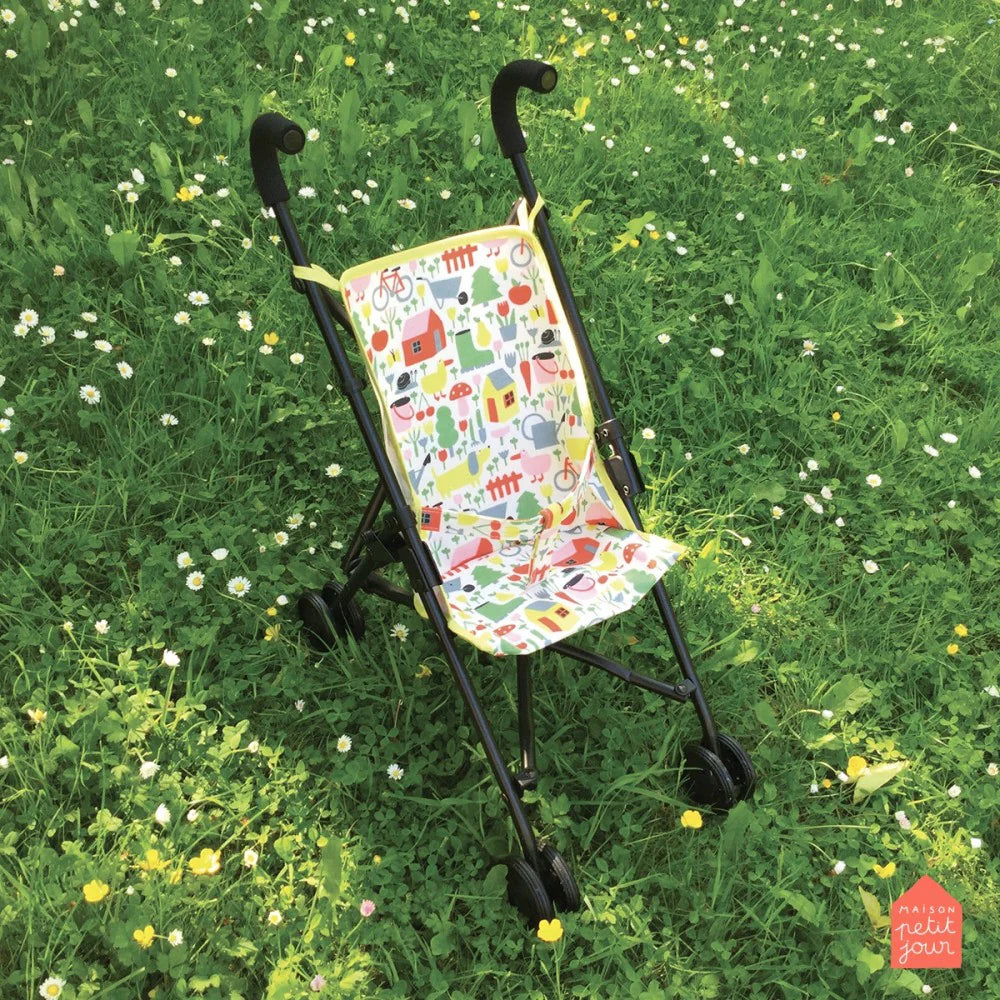 המושב של העגלה, בהדפסים משמחים ובצבעוניות יפה ומושכת את העין.