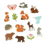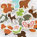 14 דמויות של חיות היער, עשויים חומר מוקצף, נדבקים בקלות לאריחים כשהם רטובים.