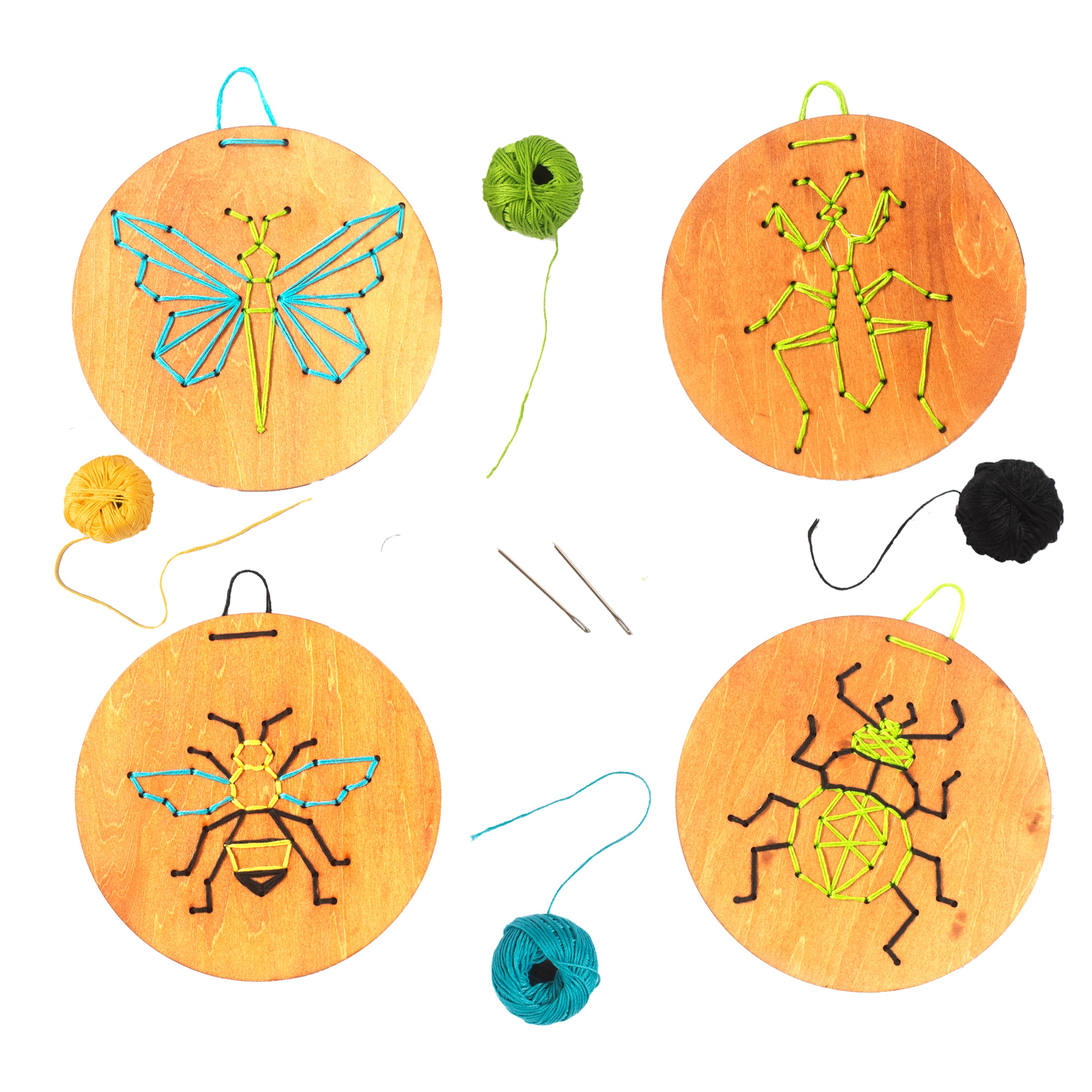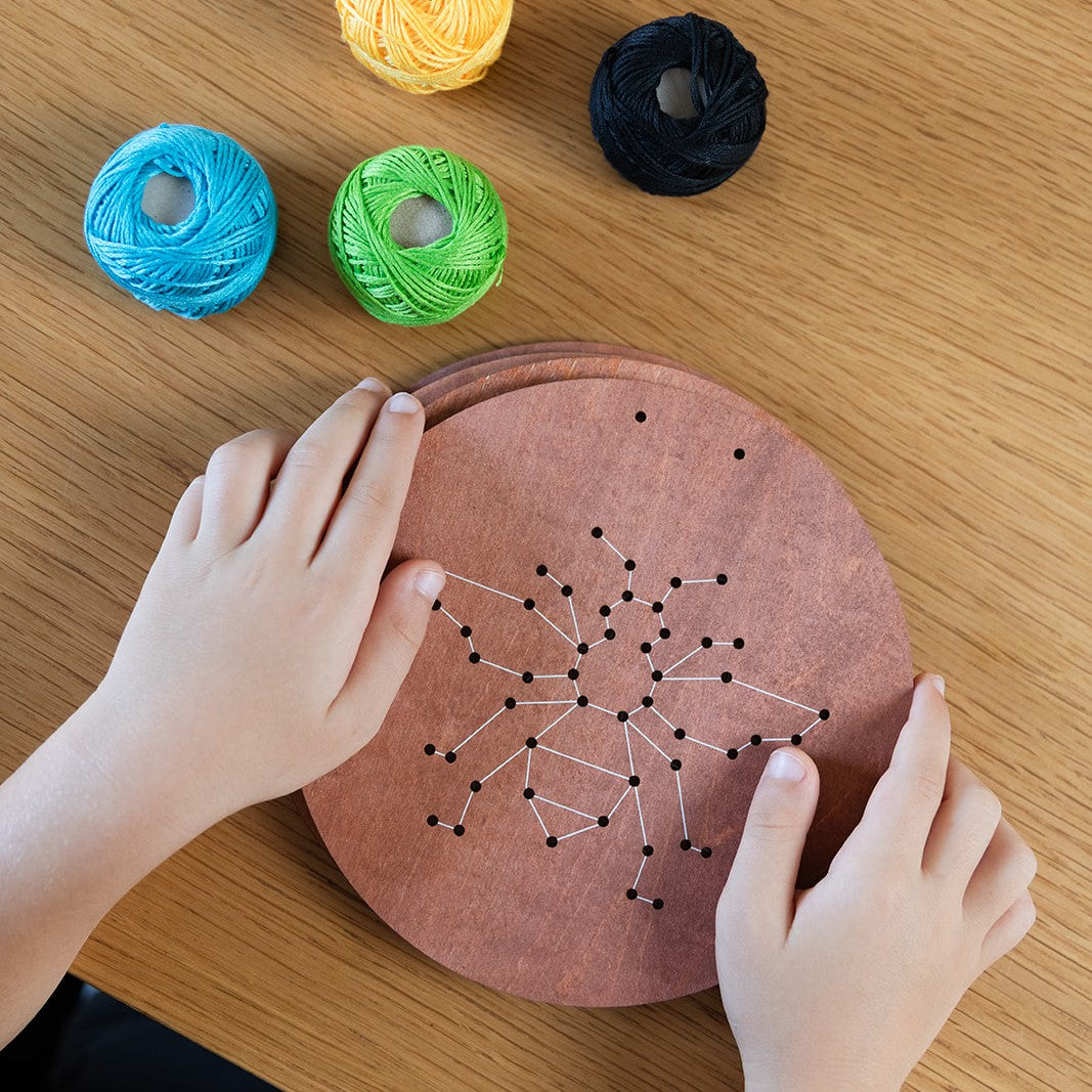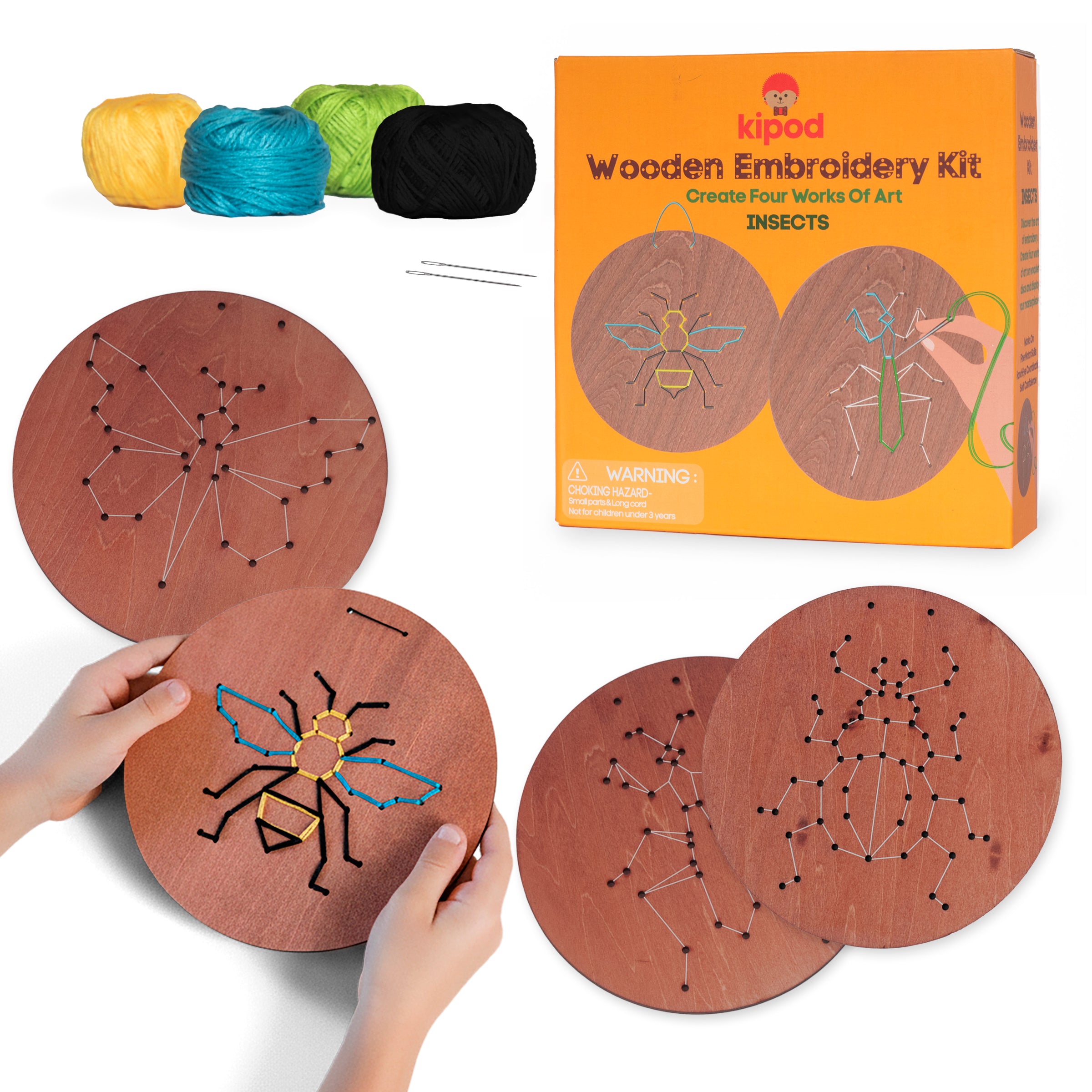 בערכה 4 דיסקים מעץ עם קווים מנחים בצבע לבן, וחורים, 2 מחטים שהן בטיחותיות לשימוש של ילדים, ו - 4 סלילי חוט ריקמה בצבעים שונים.