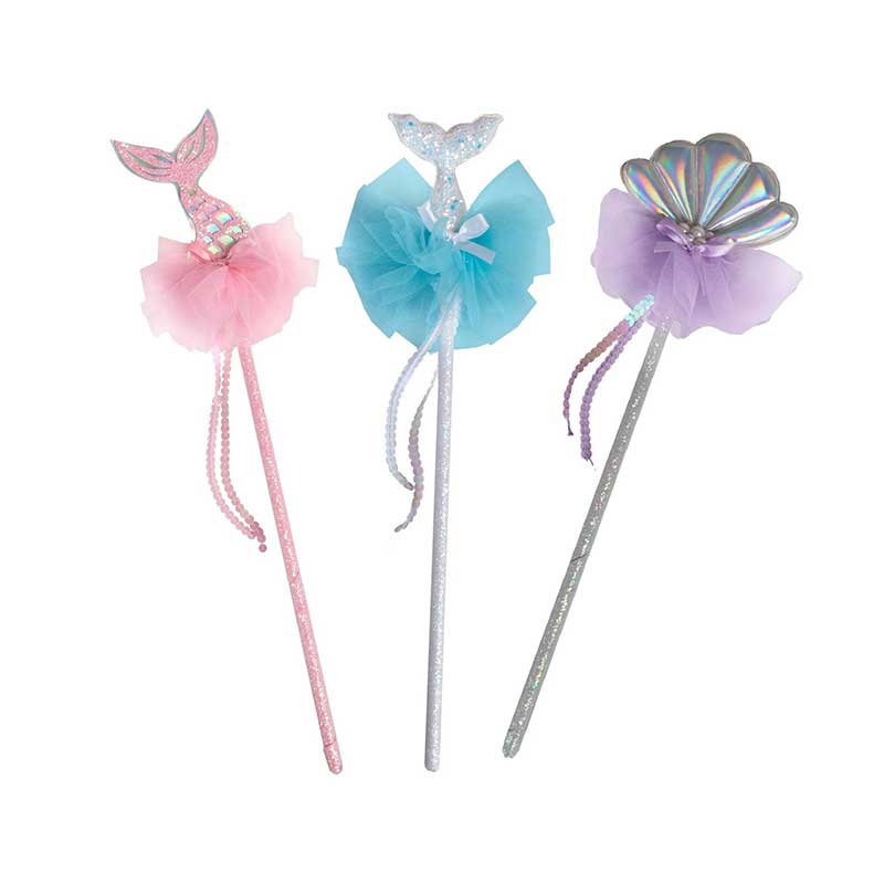 שרביט אחד ורוד מנצנץ, בראש השרביט זנב בת ים, והשני כסוף מנצנף ובראשו צדפה כסופה.