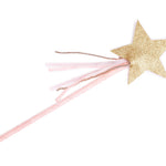 שרביט כוכב מנצנץ וגדול, המקל עטוף בד קטיפה ורוד, והכוכב מעוטר עם סרטים וחרוזי זהב.
