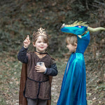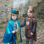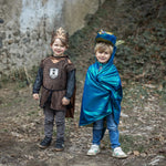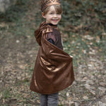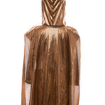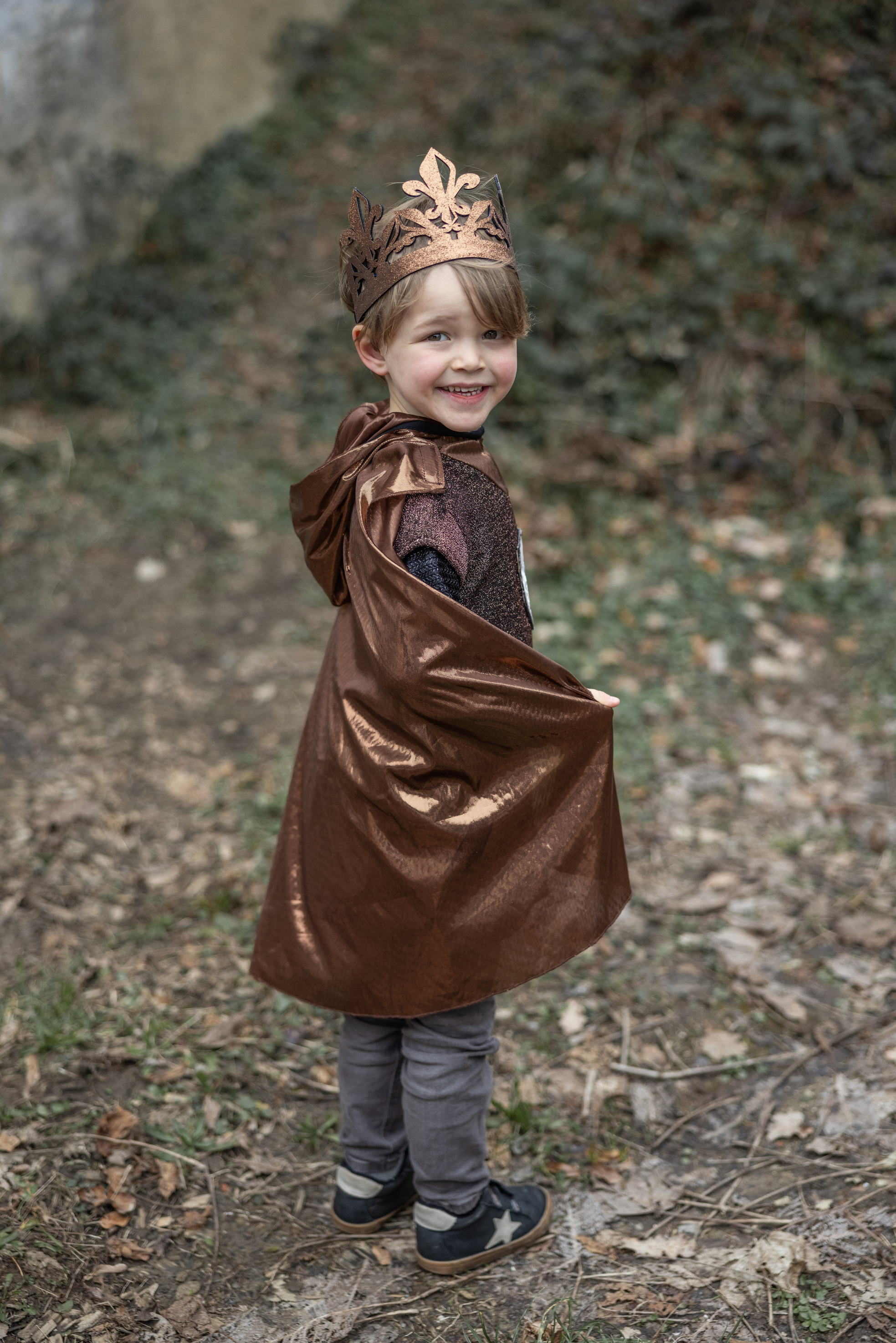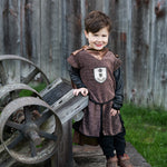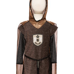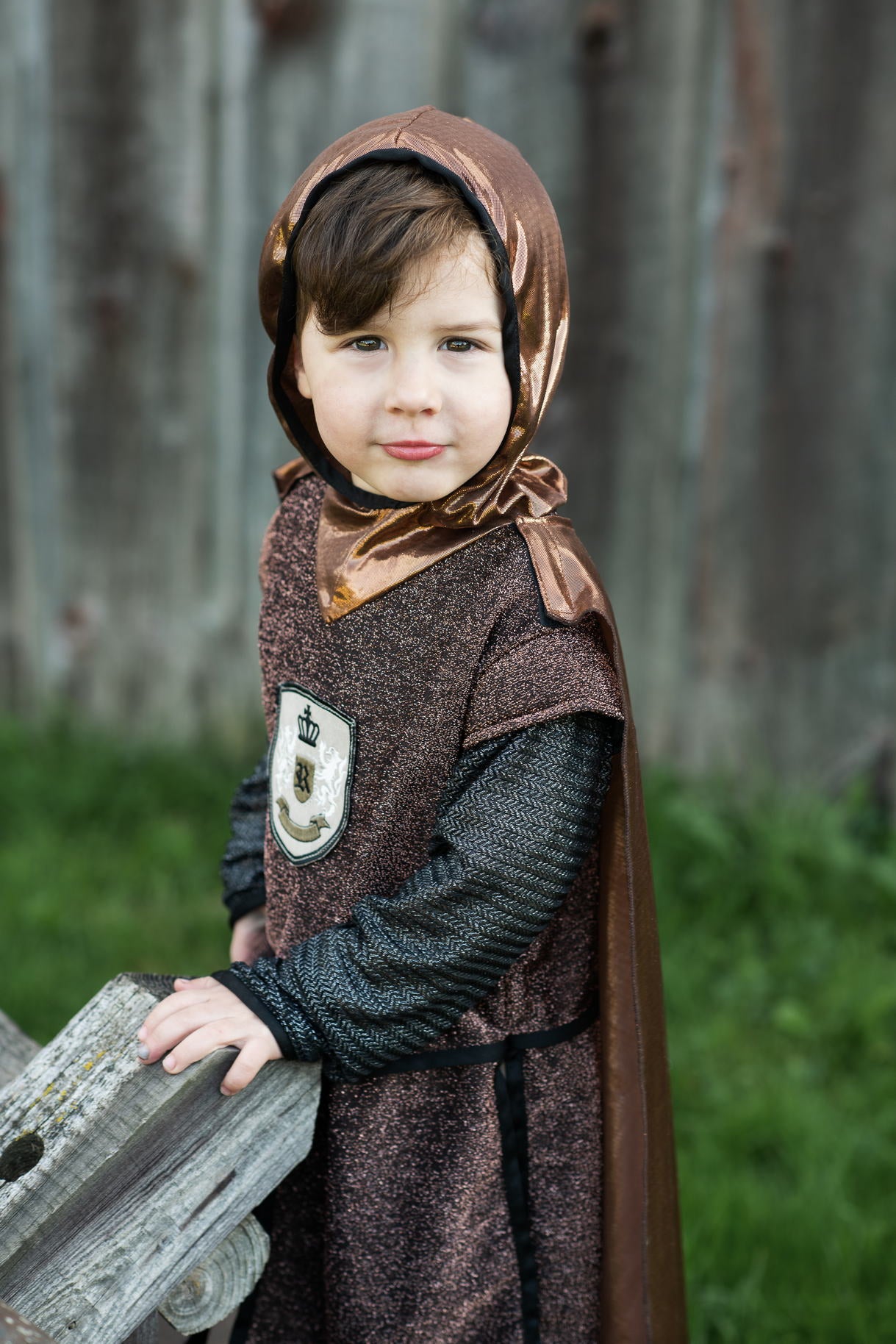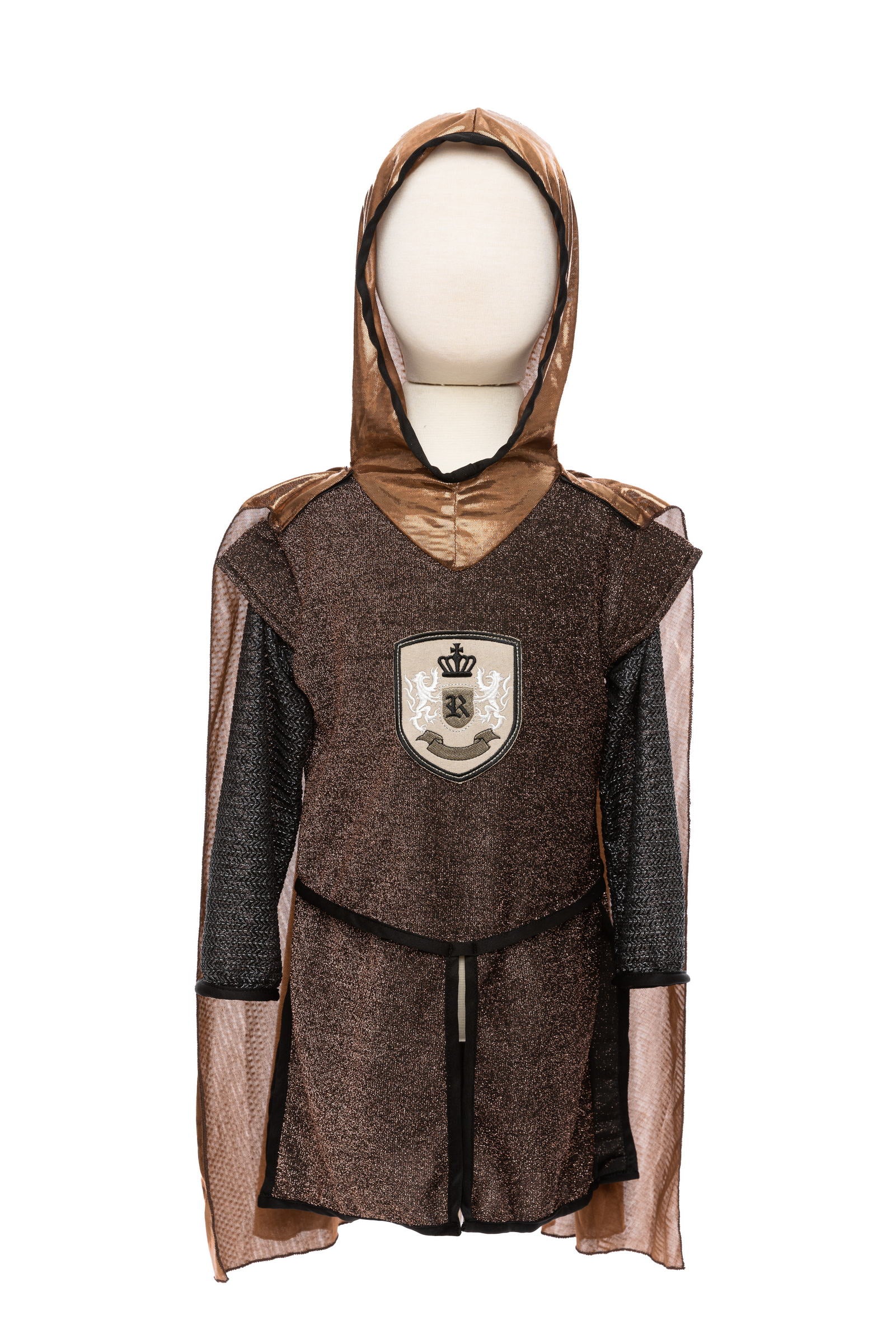 היכונו לקרב! טוניקת וגלימת נחושת מבריקה מושלמת לכל אירוע מימי הביניים או הרנסנס. סט הכולל טוניקה עם קפוצ'ון ושכמייה. הטוניקה עשויה מבד חום נוצץ ויפהפה, עם סמל אריה מעוטר בחזית. השרוולים עשויים מבד לדמות שריון ברזל, והשכמייה עשויה ספנדקס נחושת ססגוני יפה.