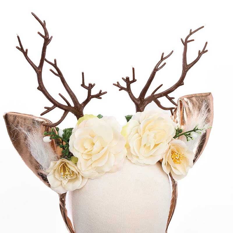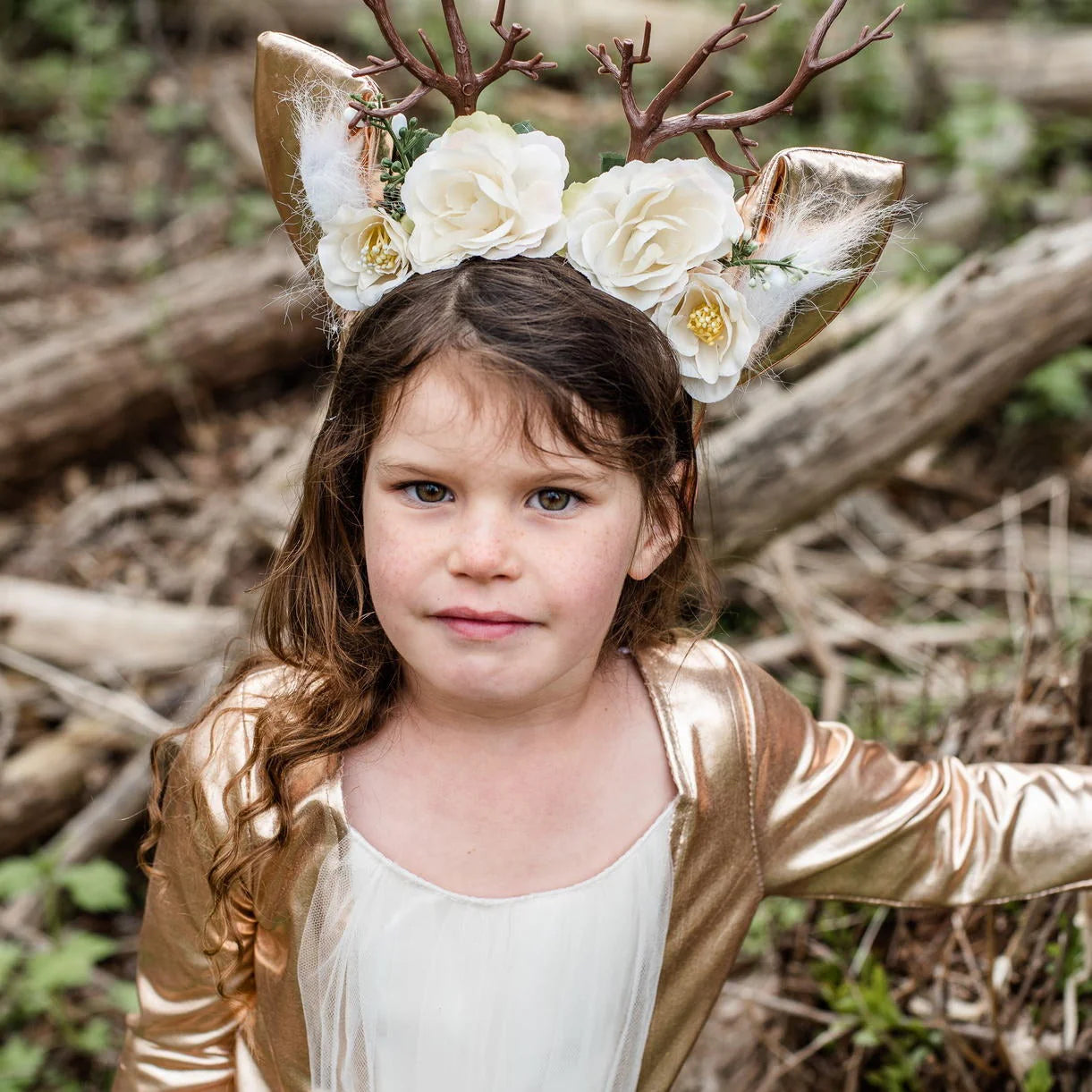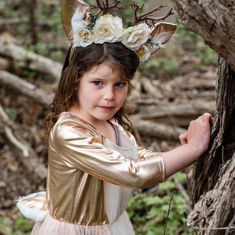 תחפושת במבית מקסימה בשמלה מלאה הכוללת נצנצים מוזהבים, אפקט אומברה על שכבות הטול, שרוול באורך ¾ וצווארון V. החצאית מרופדת כך שהיא לא נשרטת או מגרדת. סלסול הטול הלבן מסביב לקו הצוואר והזנב בגב החצאית מוסיפים לאפקט הבמבית! להשלמת המראה סרט לראש הכולל אוזניים, קרניים, ורדים ועלים ירוקים.