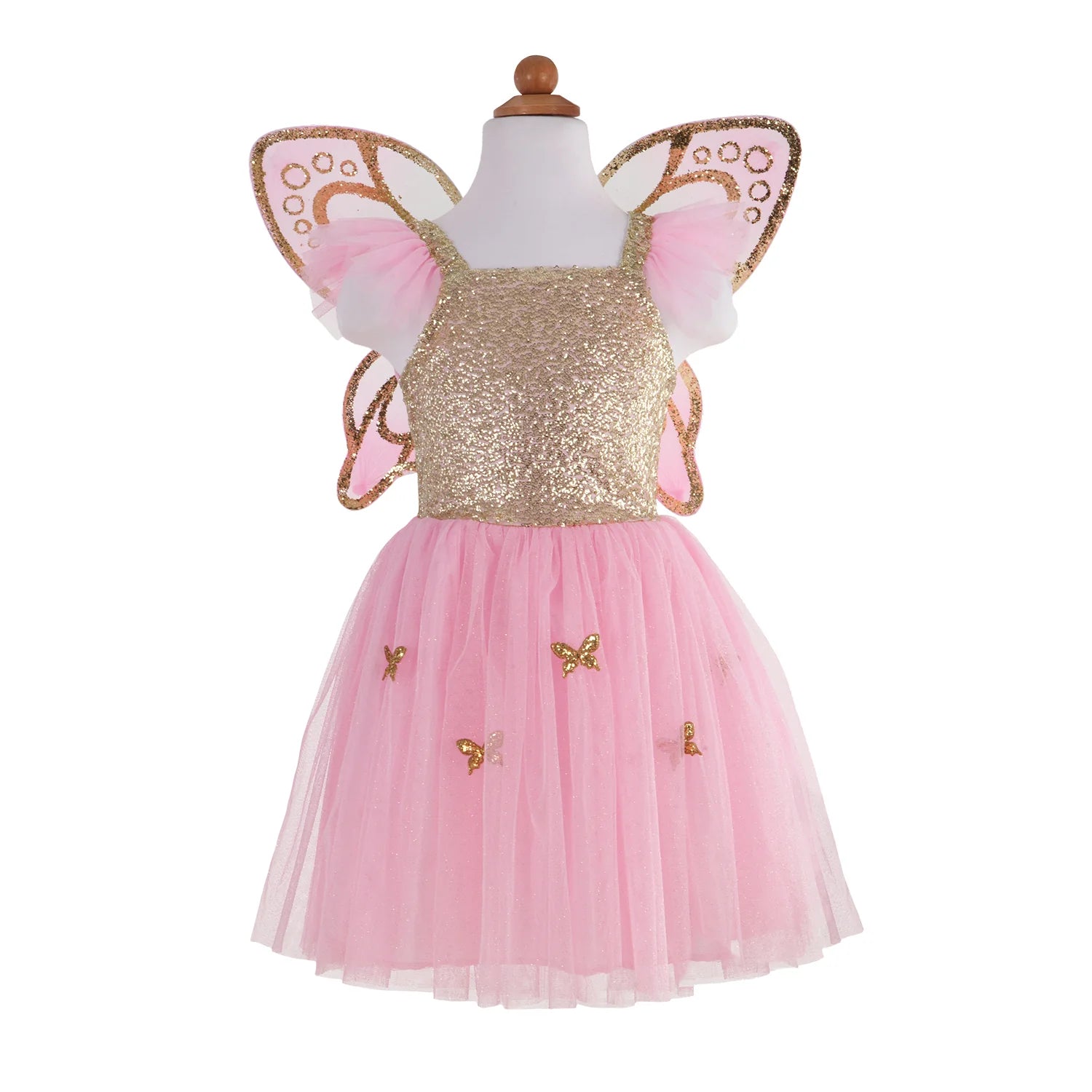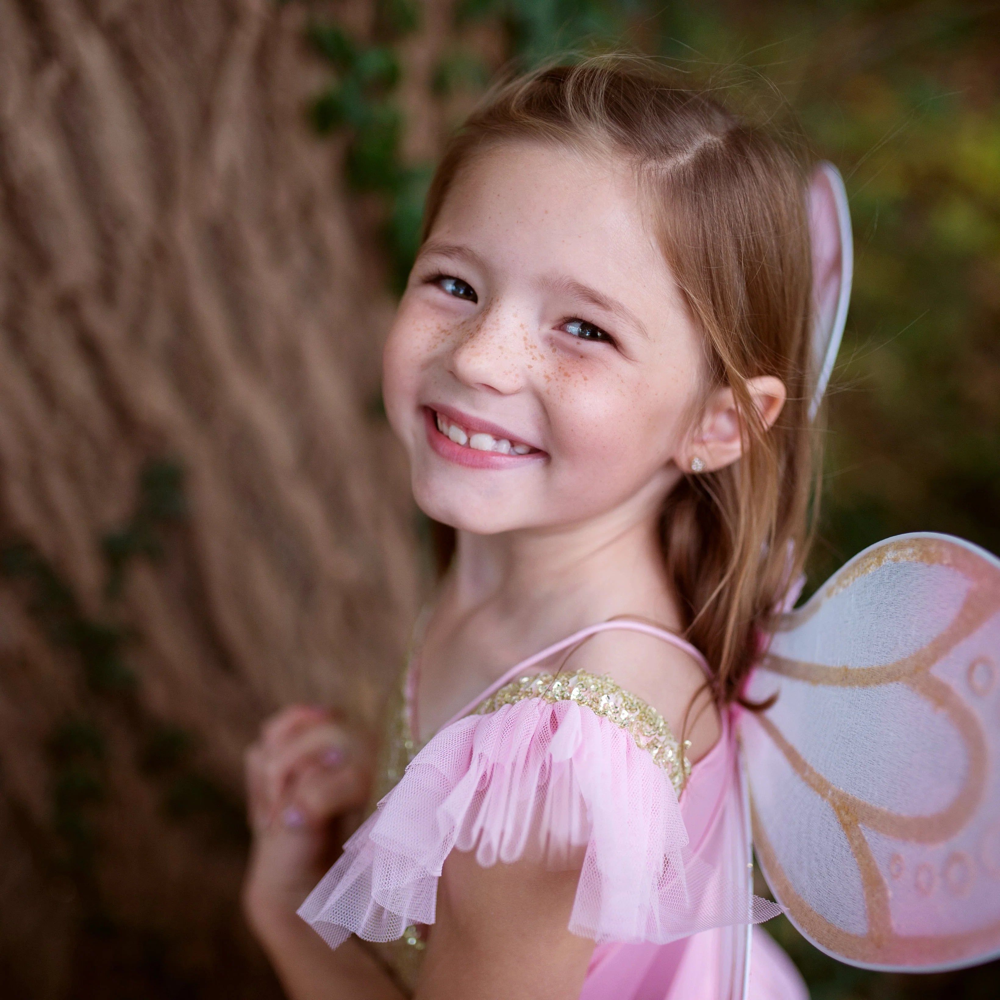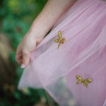 בחירת שמלה שהיא גם אופנתית וגם יכולה להיות עבור הנסיכה הקטנה שלך. שמלת הפרפרית שלנו בשמלה ורודה נוצצת זו. טול ורוד רך מתכנס לחצאית מלאה ופוגש חלק עליון מפאייטים מדהים עם הדגשות שרוולי טול. בשילוב עם כנפיים מודפסות באבק זהוב מנצנץ, שילוב שמלת שני חלקים מרהיבה.